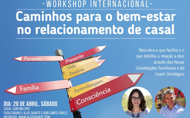 A partir das Novas Constelações Familiares (Hellinger Sciencia®) e do Coach Ontológico devidamente integrados, o workshop Caminhos para o Bem-Estar no Relacionamento de Casal traz aos participantes uma oportunidade única de olharem para si e para suas relações de um ponto de vista mais amplo, de onde poderão alcançar um grau de consciência que os ajudem a se relacionar melhor com seus parceiros (as), através da aprendizagem integral (corpo, emoção e linguagem).